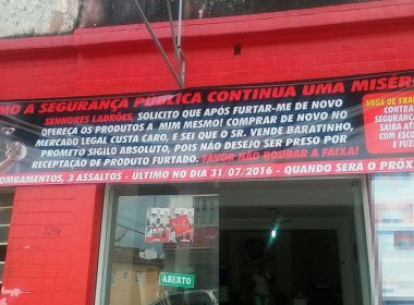 Um comerciante de Santo Antônio de Jesus, Recôncavo, colocou uma faixa em frente ao seu estabelecimento, no centro da cidade, ironizando os bandidos e a segurança pública no município. "Como a segurança pública continua uma miséria, senhores ladrões, solicito que após furtar-me de novo ofereça os produtos a mim mesmo! Comprar de novo no mercado legal custa caro, e sei que o sr. vende baratinho, prometo sigilo absoluto, pois não desejo ser preso por receptação de produto furtado. Favor não roubar a faixa!", diz o texto do anúncio. De acordo com informações do portal G1, Fábio Gulhões, de 37 anos, é dono de uma loja de utensílios para salões de beleza e clínicas de estética que é constantemente atacada por bandidos. A faixa, que já ficou na fachada do estabelecimento por 15 dias em junho de 2015, voltou a ser exposta após um arrombamento no último dia 31 de julho. "Está difícil achar até alguém para empregar e os bancos se recusam a fazer seguro, porque tem muito assalto aqui", reclama. A faixa ainda anuncia uma vaga de trabalho para segurança “com porte de arma que saiba atirar com escopeta". fonte:BN