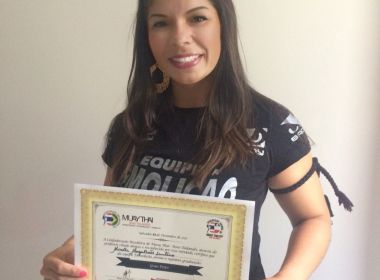 A baiana Mirelle Magalhães recebeu a graduação preta de Muay Thai no último domingo (21) e se tornou uma das primeiras baianas a chegar no mais alto grau da modalidade. Nascida em Juazeiro, Mirelle é fisioterapeuta formada e pós-graduada também se dvide nas aulas de academias como personal trainer, além de ser professora de Muay Thai, prática que começou a aprender em 2007. O esporte está no sangue da baiana, que completará 35 anos na próxima sexta-feira (2), mas pela quantidade de modalidades esportivas, principalmente de lutas, que ela já praticou poderiam muito bem levantar a suspeita de se tratar de um caso de "gato", termo usado no futebol quando um jogador altera a idade para parecer mais jovem. Mirelle começou a vida esportiva aos cinco anos praticando natação, ballet, ginástica olímpica, handball e vôlei, além de jogar futsal às escondidas por proibição da mãe. Ela foi jogadora de vôlei profissional por 17 anos, mas parou quando deixou São Paulo, onde morou entre 1998 e 2006, e voltou para Salvador. "Ainda tentei jogar quando voltei, mas aqui eu pagava para jogar, enquanto em São Paulo eu ganhava para isso", afirmou em entrevista ao Bahia Notícias. "Junto com o vôlei, passei a competir no bicicross em 99 e fui campeã regional", lembrou. Mas há males que vem para o bem. Sem conseguir jogar, ela começou a lutar no ano seguinte. Nessa época, Mirelle trabalhava como modelo, sendo inclusive ring girl de um evento de MMA, além de assistir os treinos de um ex-namorado. Ela então começou a lutar de verdade no Muay Thai, já que antes disso o primeiro contato com as lutas foi através do boxe. "Comecei apenas como atividade física de academia de musculação. Essas aulinhas fitness (risos)", ponderou. Como competia desde a infância, participando de campeonatos, Mirelle começou a sentir falta das disputas, pois apenas treinava. "Competir está no meu sangue". Sem poder ter muitos machucados por causa da carreira de modelo, ela acreditou que poderia conseguir isso no jiu-jítsu, iniciando mais uma modalidade em 2012. "De lá para cá, já disputei mais de 20 campeonatos em Salvador, no Rio de janeiro e em São Paulo", disse. Mirelle contou que, em 2013, recebeu uma proposta para representar a Bahia numa seletiva para formar uma equipe de MMA. "Isso foi uma furada, porque não teve", lembrou. Não pela desilusão, mas sim por não se adaptar à luva, ela não seguiu no MMA. Nesse mesmo ano, entrou para valer no boxe. "Tive uma aula com Carla Freitas e me apaixonei pela modalidade. Nos tornamos amigas e ela me levou para a Champion [academia do técnico Luiz Dórea]. Queria saber como era subir no ringue, levar porrada e poder devolver também (risos)", completou.
