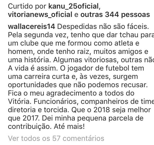 O zagueiro Wallace surpreendeu a torcida e anunciou sua saída do clube nesta quinta-feira (25), um dia após atuar no triunfo rubro-negro sobre o Vitória da Conquista por 2 a 0, na última quarta (24), pela segunda rodada do Campeonato Baiano. O defensor utilizou sua conta no Instagram para anunciar que deu fim à segunda passagem pelo clube pelo qual foi revelado. O atleta de 30 anos indicou uma ‘oportunidade que não pode recusar’ para deixar o clube baiano. Ele, no entanto, não revelou qual clube deverá atuar. Neste retorno à Toca do Leão, Wallace atuou em 23 partidas e marcou dois gols. Ao todo, ele atuou em 114 partidas pelo clube baiano e anotou sete gols. Com a camisa rubro-negra, ele foi tetracampeão estadual, entre 2007 e 2010, foi titular no time vice-campeão da Copa do Brasil, em 2010 - inclusive, marcou um gol na final - e participou da campanha do acesso à Série A, em 2007. Agora, para a posição, o técnico Vagner Mancini conta com Kanu, Bruno Bispo e Ramon, que está lesionado. Confira a publicação de Wallace abaixo: