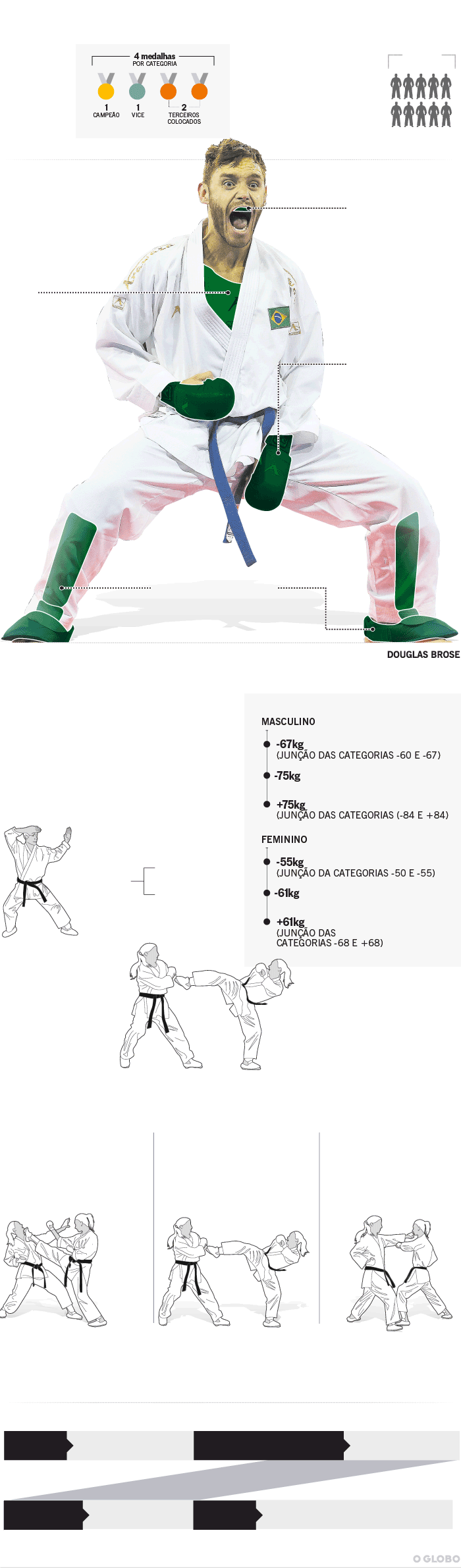 Ao lado do surfe e do skate, esportes que estreiam nos Jogos de Tóquio, em 2020, o caratê está na lista de prioridade do Comitê Olímpico Brasileiro (COB). Isso porque, assim como os radicais, que contam com Pedro Barros e Gabriel Medina, o caratê também tem suas estrelas. Hoje, três caratecas estão entre os três melhores do mundo no kumitê (luta), segundo ranking da Federação Internacional de Karatê (WKF). Douglas Brose, 32, é o líder da categoria -60kg, Vinícius Figueira, 26, o segundo melhor do mundo com -67kg, e Valéria Kumizaki, 32, terceira na lista de -55kg. O Brasil é o quarto colocado no ranking, atrás de Japão, Irã e Austrália.