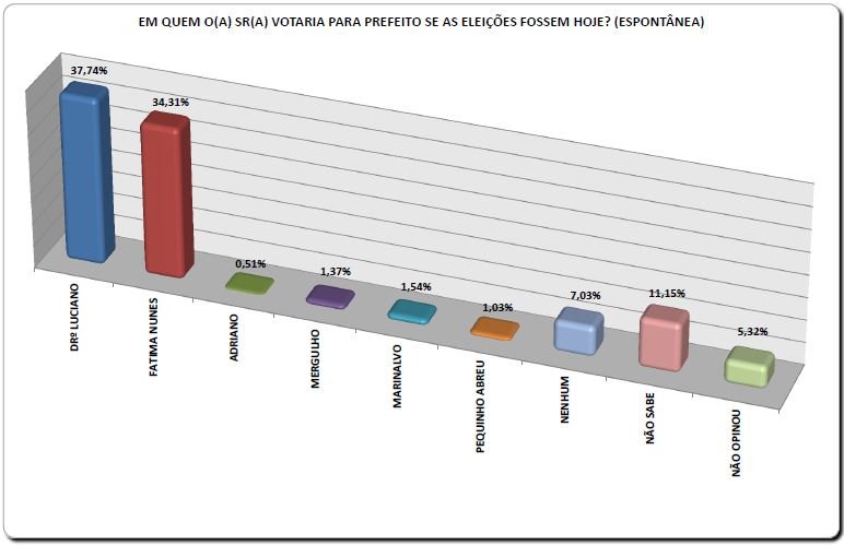 No cenário estimulado, em que os candidatos são listados aos entrevistados, a margem de Dr. Luciano ampliou em relação a Fátima Nunes. O prefeito aparece com 40,31% da intenção de votos frente a 35,16% da ex-prefeita, também em empate técnico, porém com uma diferença maior do que no cenário espontâneo. Pequinho Abreu fica em terceiro lugar com 2,40%. No cenário, 9,26% não soube responder, 6,86% não declarou voto nenhum dos candidatos e 6% não opinou.