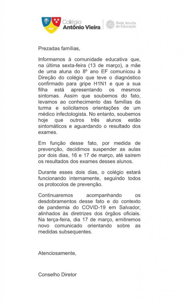 O colégio Antônio Vieira suspendeu as atividades escolares nesta segunda (16) e terça (17). A decisão foi tomada após a mãe de uma aluna testar positivo para H1N1 e a filha e outro três alunos da unidade apresentarem sintomas semelhantes. A suspensão das atividades é uma resposta a expansão do coronavírus, cujos sintomas iniciais são aprecidos aos de outras viroses, a exemplo da detectada. Os docentes aguardam resultado de exames laboratorias.