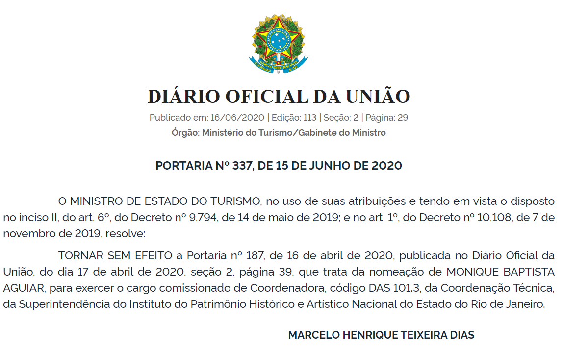 “TORNAR SEM EFEITO a Portaria nº 187, de 16 de abril de 2020, publicada no Diário Oficial da União, do dia 17 de abril de 2020, seção 2, página 39, que trata da nomeação de MONIQUE BAPTISTA AGUIAR, para exercer o cargo comissionado de Coordenadora, código DAS 101.3, da Coordenação Técnica, da Superintendência do Instituto do Patrimônio Histórico e Artístico Nacional do Estado do Rio de Janeiro”, diz texto da portaria publicada no Diário Oficial da União desta terça-feira (16).