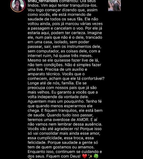 Ela disse ainda que ele não tem condições de fazer live - uma das maiores reivindicações dos fãs - do local onde se encontra. "Precisa de um aparato técnico. Vocês que o conhecem, acham que ele tá confortável? Longe até de nós, família. Ele se preocupa com nossos pais, que já são mais velhos. Eu garanto a vocês que volta independe da vontade dele. Aguentem mais um pouquinho. Tenho fé que quando menos esperarmos ele chega. E fiquem tranquilos, ele está bem de saúde. Quando tudo isso passar, teremos uma overdose de amor. E aí não vamos nem lembrar dessa ausência. Vocês vão até agradecer. Porque isso só vai consolidar mais ainda esse amor, essa cumplicidade, essa troca, essa felicidade. Porque saudade a gente só tem de quem gostamos ou amamos", finalizou.