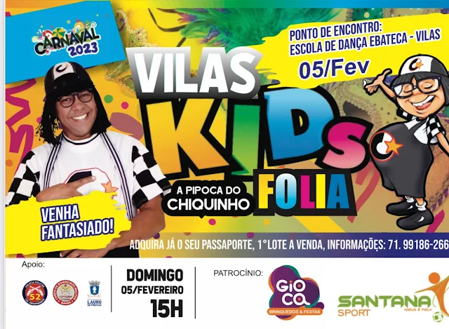 E neste domingo 05, às 15 horas, acontece a 3° edição do Vilas Kids Folia Vilas, o bloquinho puxado pelo Chiquinho no bairro de Vilas do Atlântico, e a animação dá início na Escola de Dança EBATECA e encerra no clube de Vilas, com muita música a vivo e brincadeiras, sorteios e muita diversão para criançada e toda família no VILAS KIDS FOLIA 3 EDIÇÃO.