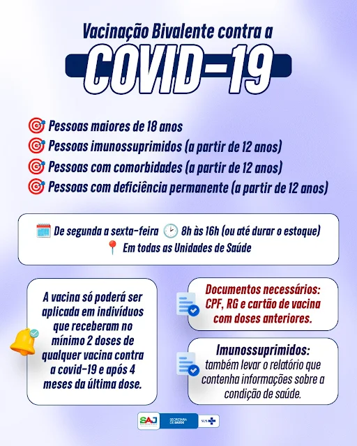 Com o objetivo de manter em dia o cronograma vacinal contra a COVID 19 dos munícipes atualizados, a Prefeitura Municipal de Santo Antônio de Jesus, através da Secretaria Municipal de Saúde (SMS), deu início a mais uma etapa da vacinação bivalente contra a COVID-19. Nessa nova etapa de imunização, foram inclusos todas as pessoas maiores de 18 anos.